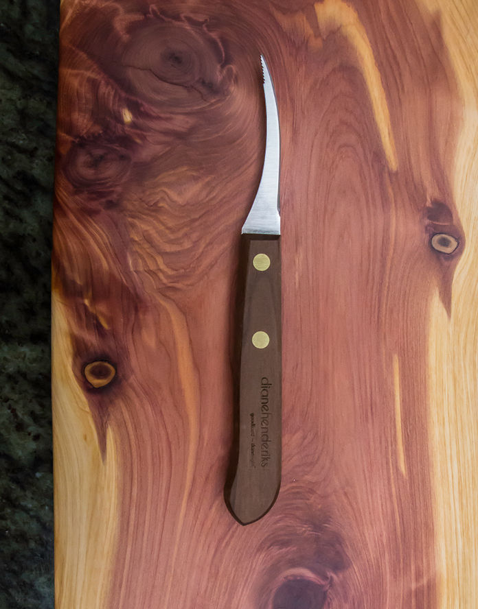 This unique walnut handled tool shells and deveins shrimp in one stroke. The 3-inch curved blade follows the contours of the shrimp while the teeth on the bottom edge grab the vein. To use, simply push the blade through the shell, and pull up. Flip the blade over to butterfly shrimp.